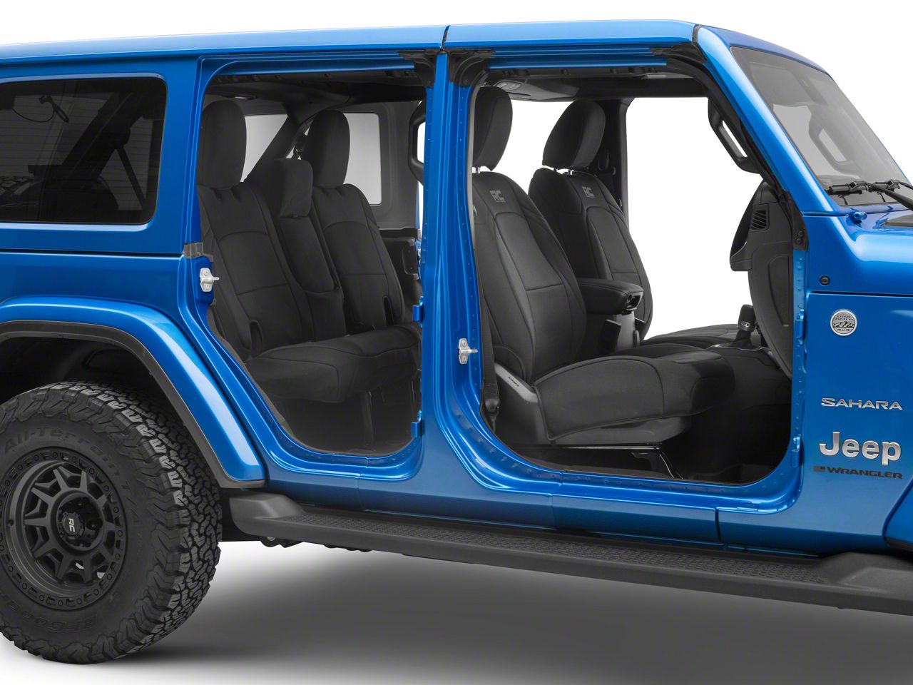 Application. Rough Country Black Neoprene Front and Rear Seat Covers fit all 2018-2026 Jeep Wrangler JL 4-door models with rear arm rest.