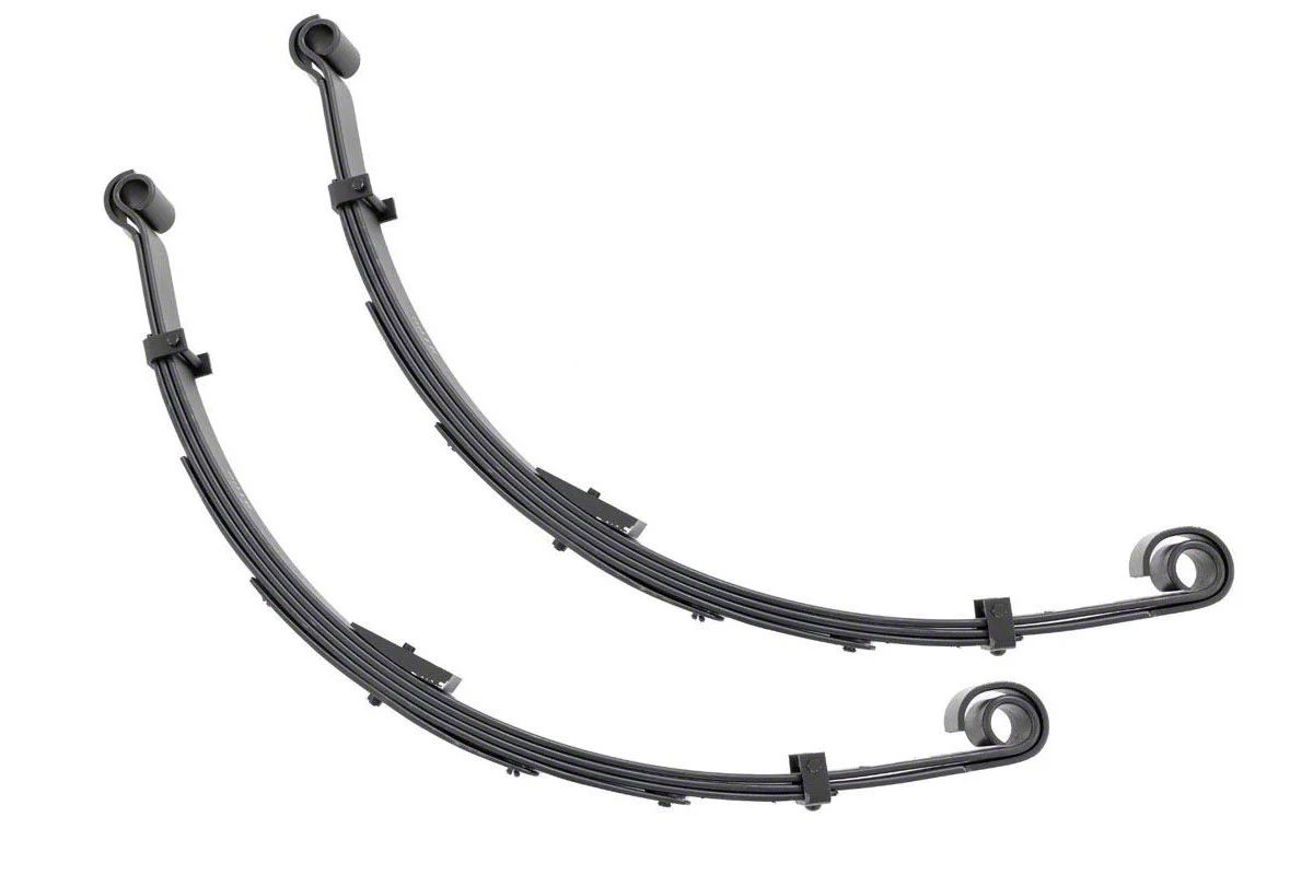 Construction and Appearance. Built with a multi-leaf configuration and tapered leaves, these springs offer flexibility, strength, and long-term durability. The integrated spring pads minimize friction between leaf surfaces, helping to reduce noise and provide a factory-like ride quality. Each set includes high-quality bushings and is finished to withstand harsh environments, whether on or off the road.