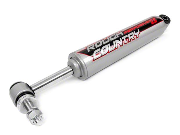 Solid Construction. This Rough Country steering stabilizer features heavy-duty construction to withstand rough use. It comes with a powder-coat finish for added strength and durability. The Performance 2.2 series stabilizer features a 17.5mm chrome-hardened piston rod and polyurethane bushings to provide smooth performance.