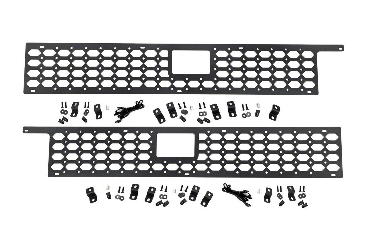 Secure and Organize. The Rough Country MOLLE Panel Bed Mounting System is designed to keep your gear securely in place while driving. This versatile system is perfect for mounting items like a 48-inch Hi-Lift jack, traction boards, tow straps, first aid kits, and toolboxes. It helps prevent your gear from shifting around, ensuring everything stays in place even on rough terrain.