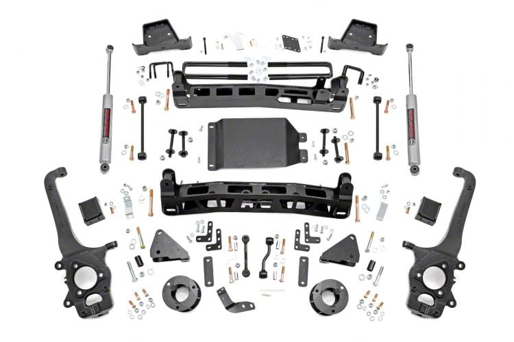 New Height and Leveled Stance. The Rough Country 6-Inch Suspension Lift Kit is a premium product designed to enhance your vehicle's performance and style. With a substantial lift height of 6 inches, this kit delivers unparalleled ground clearance, allowing you to conquer challenging terrains with ease. This lift kit can retain the factory ride quality, ensuring a comfortable driving experience even after the installation. The lift kit also provides a leveled stance from the front to the rear of your vehicle, adding an aesthetic appeal and improving overall balance.