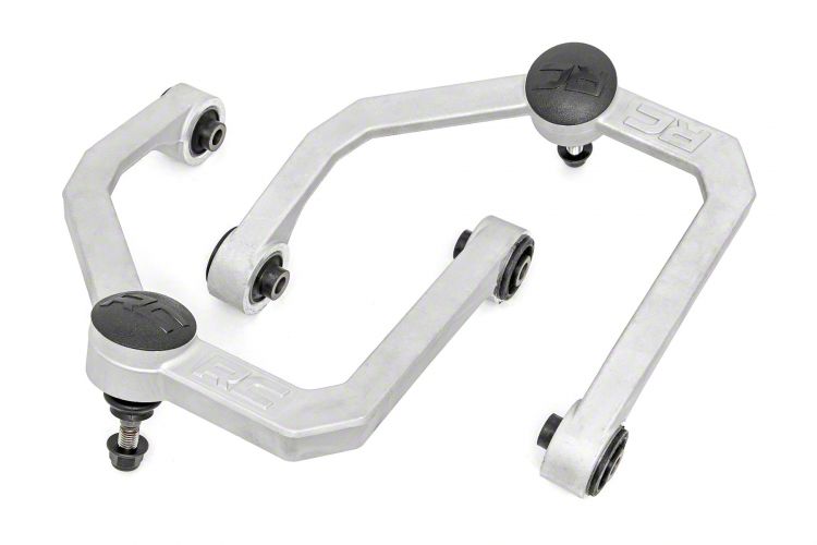 Sturdy Functional Design. The Rough Country Forged Upper Control Arms are specifically designed for 2 to 3-inch lifted vehicles, ensuring a perfect fit and enhanced suspension geometry. Constructed from durable forged solid aluminum, they deliver unrivaled strength and reliability, standing up to the toughest off-road challenges. Whether you're conquering rocky terrains or navigating through city streets, these control arms are built to withstand wear and tear, providing long-lasting durability. Crafted with OE-style rubber bushings, they maintain smooth and quiet operation while offering improved articulation for a more controlled and comfortable ride.