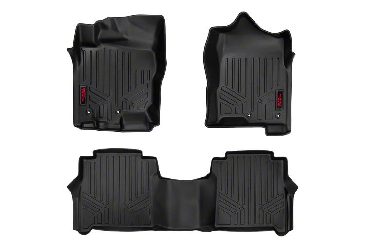Modern Seat Styling. Step up your Titan Crew Cab's interior protection with the Rough Country Heavy Duty Front and Rear Floor Mats; Black. The design of these floor mats is as practical as it is robust. They feature deep grooves and ridges that trap and hold liquid, dirt, and debris, preventing them from spilling onto your vehicle's carpet. This unique design not only safeguards your vehicle's interior but also makes cleaning the mats a breeze.