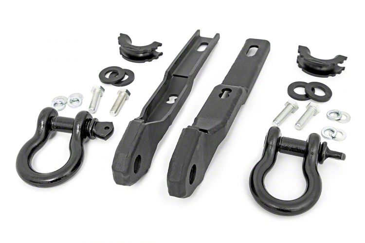 Enhanced Towing and Recovery Support. Elevate your vehicle's towing and recovery capabilities with the Rough Country Tow Hook Mounting Brackets, complete with D-Ring Shackles and Rubber Isolators. These mounting brackets are designed to boost your vehicle's towing prowess, making them ideal for off-road recovery and challenging towing tasks. The inclusion of D-Ring Shackles adds versatility to your towing options, allowing for secure and reliable attachment points. The rubber isolators play a crucial role in reducing noise during towing, ensuring a smoother and quieter operation.