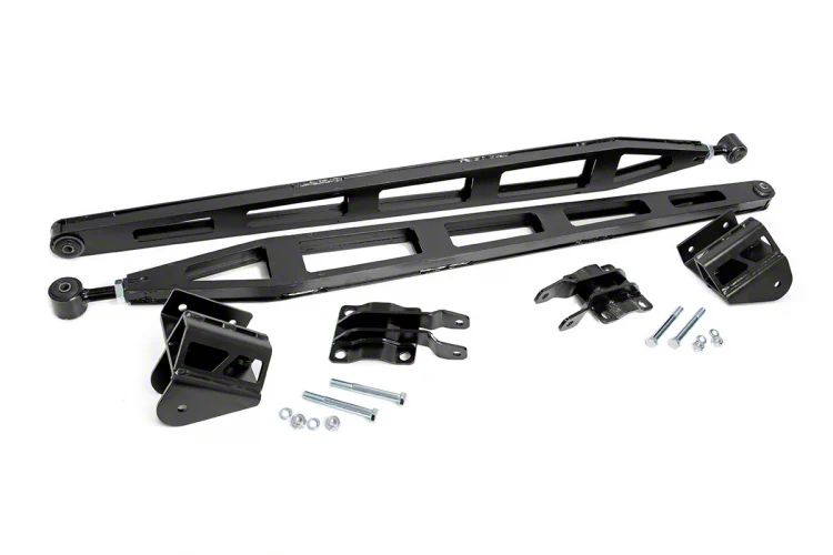 Get a grip with Rough Country's Traction Bar Kit for 16-18 Nissan Titan XD Crew Cab models. These heavy-duty Traction Bars help prevent wheel hop and axle wrap by aligning and stabilizing the rear axle geometry, allowing for full travel and articulation without binding. Once installed, these bars prevent the type of movement and pinion angles that cause a loss of traction. Perfect for re-claiming traction while towing or during quick acceleration.Not just any bar can get the job done, and Rough Country's "Ladder Bar" design combines relentless strength with aggressive good looks. Rough Country's Titan XD Traction Bar features Clevite Rubber Bushings and a threaded adjustable end for an easier install and true adjustability. Works on any 16+ Nissan Titan with 6 inches of lift. Best of all these Traction bars feature Rough Country's Lifetime Replacement Warranty!