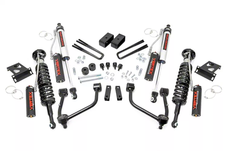 Boosts Off-Road Performance. Take your Tundra to the next level by installing this Rough Country 3.50-Inch Bolt-On Arm Suspension Lift Kit with Adjustable Vertex Coil-Overs and Vertex Shocks. The kit lifts your truck by 3.50 inches and allows larger tires with up to 34-inch diameter to be installed. Finally, it includes Adjustable Vertex Coil-Overs and Vertex Shocks to maximize the off-roading performance of your truck.