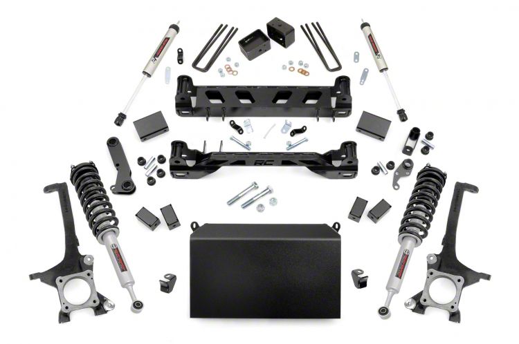 Go Off-Road. Off-roading can be tough on your Tundra’s stock suspension, that's why you need a lift kit that was specifically designed to take on the great outdoors. Luckily, this Rough Country 4.50-Inch Suspension Lift Kit has what you need to help you take on the obstacles found on and off-road. With 4.50 inches of lift, this kit can accommodate tires up to 35 inches in size. This Rough Country Kit features tubular upper control arms as well as fabricated steel lift blocks for extra strength. What’s more, the included Lifted N3 Front Struts and V2 Monotube Rear Shocks will provide a highly comfortable ride, even when tested across rough terrain.
