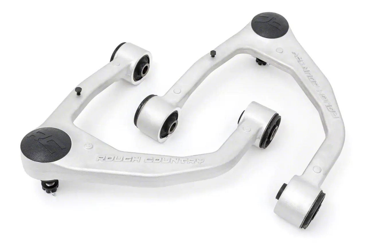 Solid Forged Aluminum. The Rough Country Forged Upper Control Arms are constructed from solid forged aluminum material, these control arms are wrapped up in a vibrant finish that adds a bold touch to your truck's suspension system. The control arms are integrated with greaseable Clevite OEM-like rubber bushings and outfitted with POM ball joints for improved suspension articulation and longevity.