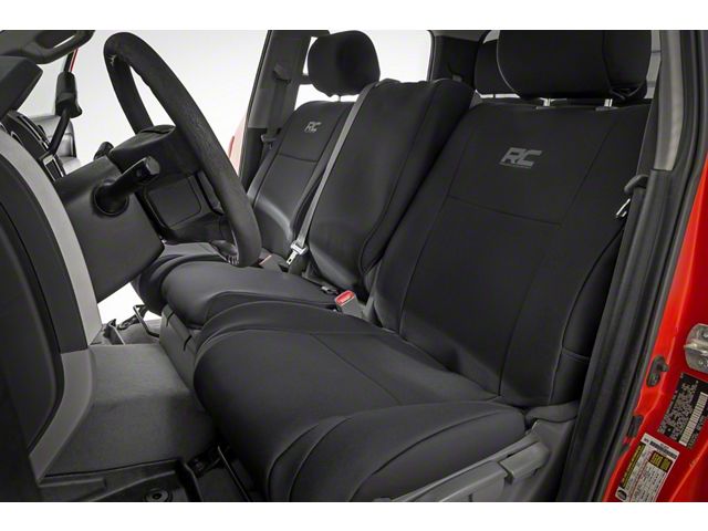 Seat Protector. Maintain your seats’ pristine condition with the Rough Country Neoprene Front and Rear Seat Covers in Black. This set of front and rear seat covers offers full coverage, including headrest covers. They follow factory specifications to ensure a snug fit and a clean professional look. These seat covers will protect your seats from dirt, mud, and stains.