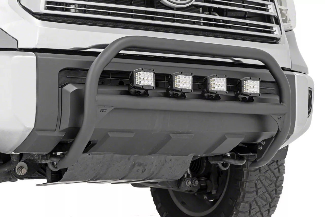 Protects the Front-End and Provides Light Mounting. Add this Rough Country Nudge Bar on your Tundra’s front end to give it some off-road flair. This nudge bar adds a very rugged yet stylish touch to your truck. It also supplements your front-end protection. It shields your front components from impacts, from a runaway shopping cart to crossing wildlife.