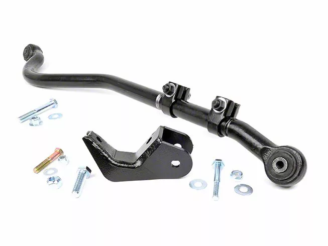 Stay Centered. Designed as a superior factory replacement, Rough Country's Forged Front Adjustable Track Bar will provide an easy solution to keep your TJ's front axle centered. Nearly twice the weight of the factory equipment, this bar can easily take on the trails and maintain your lifted Jeep's stance and handling. This set up includes a relocation bracket to provide appropriate angles and center the front axle on Wranglers with 0-3.5 inches of lift.