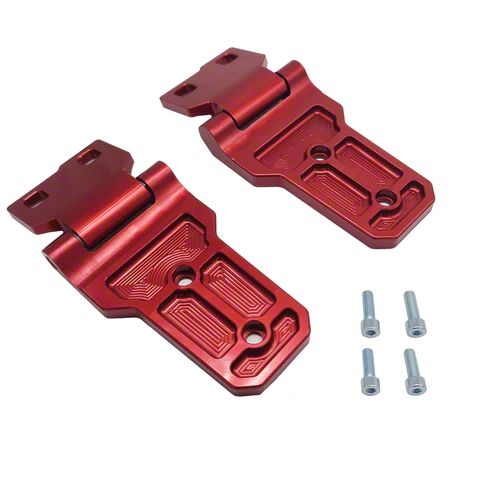 Superior Aluminum Performance. The Royal Hooks Aluminum Hood Hinges for all 2020-2025 Jeep Gladiator JT Models are a sleek and durable replacement for the stock hood hinges. Made from high-quality aluminum, these hinges are designed to be both lightweight and strong, providing superior performance to the factory hinges. The red powder-coated finish adds a stylish touch to the Jeep while also offering superior corrosion resistance.