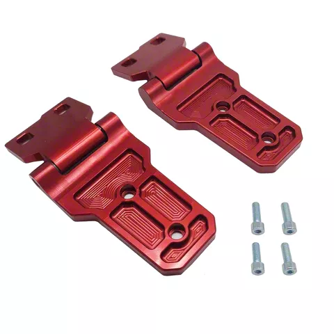 Superior Aluminum Performance. The Royal Hooks Aluminum Hood Hinges for all 2018-2026 Jeep Wrangler JL models are a sleek and durable replacement for the stock hood hinges. Made from high-quality aluminum, these hinges are designed to be both lightweight and strong, providing superior performance to the factory hinges. The red powder-coated finish adds a stylish touch to the Jeep while also offering superior corrosion resistance.