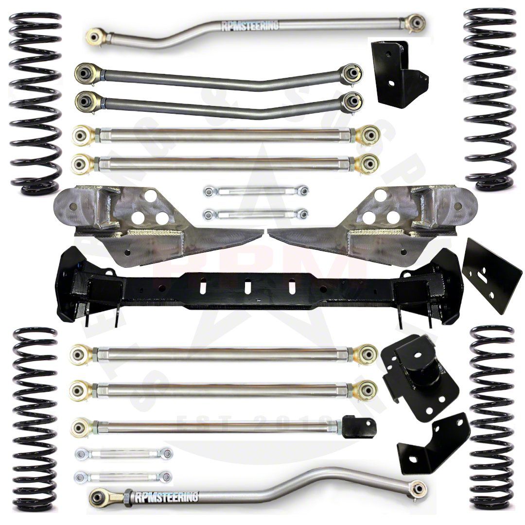 JLU Wrangler 3.5'' Ultimate Aluminum Long Arm Lift Kit Ready to take your Jeep to the next level? For around a decade, RPM Steering and Suspension has been manufacturing premium suspension components like our Ultimate 7075 T6 Aluminum control arms, track bars, and sway links. We are now bringing all of these parts together and pairing them with some of the top springs in the industry to bring complete RPM Steering and Suspension lift kits. These kits will feature our USA-sourced and milled aluminum links with Rock Jock Narrow Johnny joints at each end for the best articulating long arms in the industry. At the same time, the Rock Jock ends provide a superior on-road feel and comfort. Our ultimate track bars have been performing for years using 1-3/8" .281 wall DOM for a perfect balance between comfort and strength with Rock Jock joints at both ends for industry-leading durability. As always, our parts come with our lifetime bend or break replacement warranty (see warranty page for details). Now let's take that Jeep to the next level! THIS KIT REQUIRES CUTTING AND WELDING: Front cross member and supporting brackets are primarily bolt-on after some drilling and cutting away the factory control arm mounting brackets. Rear mounts require welding on the frame side. Cutting away the factory control arm brackets is required. The gas tank does not need to be removed. Minor trimming of the gas skid is required and a few bolts will need to be removed to allow movement of the tank for easier access while welding.