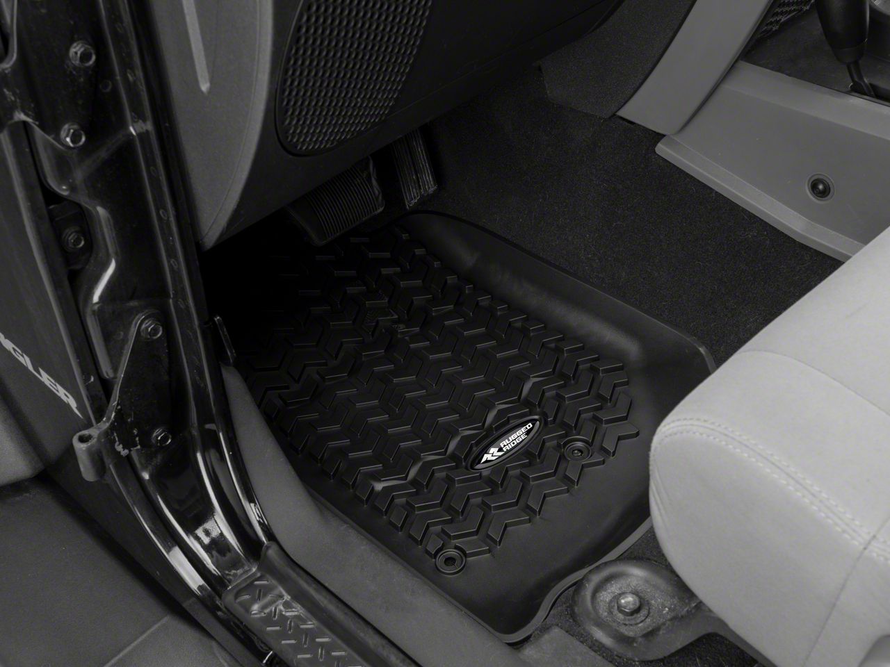 Smart Design. Protect your investment with the Rugged Ridge All Terrain Floor Liner 5-Piece Kit in Black. These JK floor mats feature a deeply molded, chevron-shaped tread pattern to efficiently channel away dirt, water, snow and spills. They adjust to the shape and contours of your Jeep's floor for a perfect fit. The high-perimeter walls provide maximum containment and enhanced interior protection for superior performance when traveling through muddy terrain.