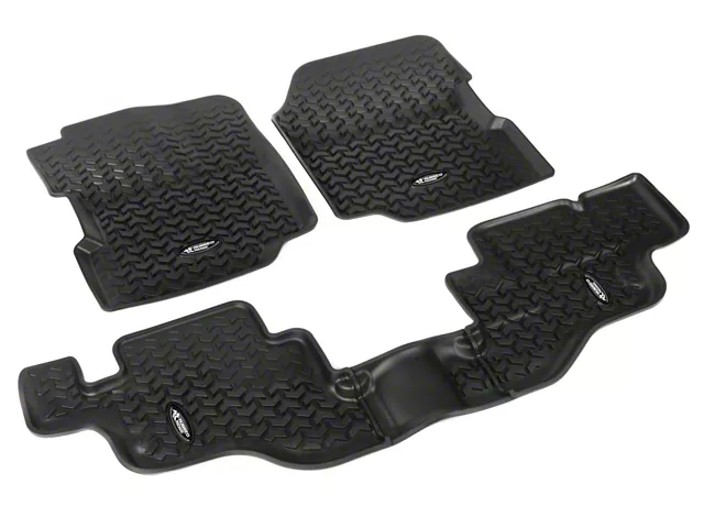 Smart Design. Protect your YJ's carpets with the Rugged Ridge All Terrain Floor Liner 3-Piece Kit in Black. These floor liners feature a deeply molded, chevron-shaped tread pattern to efficiently channel away dirt, water, and snow. The floor liner adjusts itself to the shape and contours of your Wrangler's floor for a perfect fit. The high-perimeter walls provide maximum containment and enhanced interior protection for superior performance when traveling through muddy terrain.