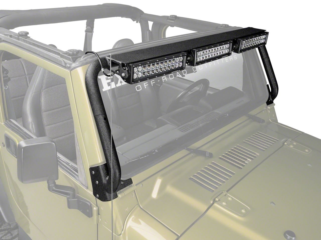 Low Profile Design. Most over the windshield light bars and mounts will raise the total height of your Wrangler, making it difficult to store in garages or under car ports. Rugged Ridge's Windshield Light Bar Kit features a unique, low profile design which puts three LED lights just at the top of your windshield glass, instead of over the metal frame like other options. It's integrated wind deflector will help to reduce whistling at higher speeds, and minimize buffeting of your soft top for a quieter, more comfortable on road ride.