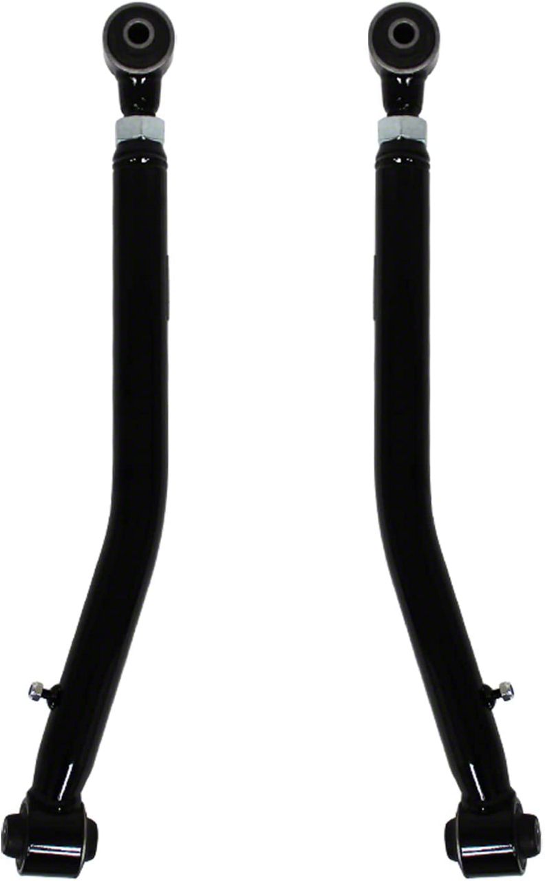 Stock-Style Bushing. Featuring integrated stock-style rubber bushings, forged flex-end, and a steel jam nut, these adjustable front lower control arms provide enhanced stability and improved handling for your Jeep. With a sleek and durable black finish, they are a great addition to your off-road vehicle.