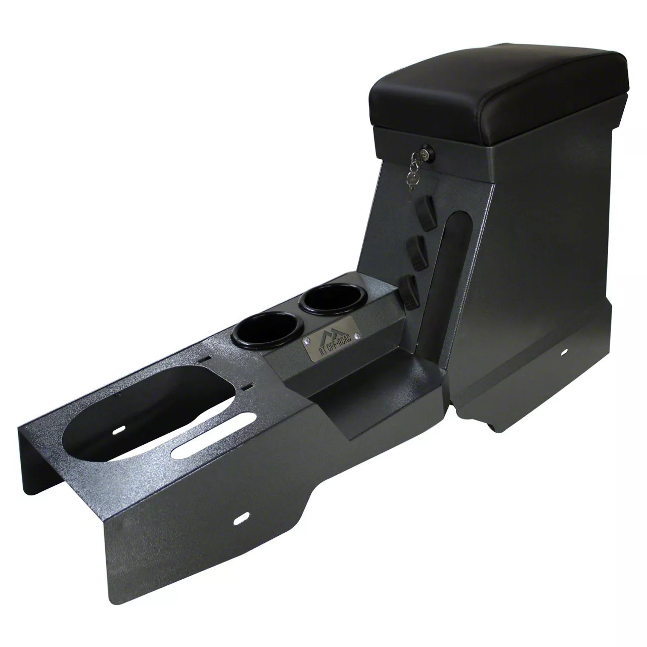 Increases Storage Space. This Locking Center Console (Gray) will boost the amount of storage space in your Jeep by giving you space for 2 front and 2 rear cup holders as well as a spring-action coin organizer. This product is pre-wired and uses riveted construction. The locking center console is also sold individually.