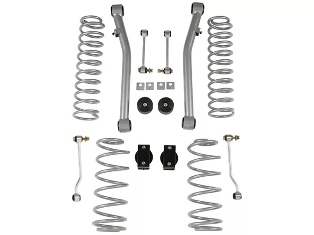 Reliable Front Lower Arms. The Rubicon Express 2.50-inch Super-Ride Suspension Lift Kit also comes with a pair of highly durable front lower arms. Featuring a 1.75-inch-diameter 4130 chromoly construction, this kit will definitely improve your Jeep’s performance and handling. Take that performance boost to the next level when you install the extended sway bar links and bump stops included in this kit.