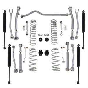 Complete Set of Adjustable Control Arms. This suspension lift kit comes with a complete set of adjustable front and rear control arms, which help smoothen and soften the up-and-down movement of your Jeep when you hit bumps and potholes. The result is a comfortable and quiet ride quality. You can also recover faster from bumps and dips, and experience improved handling.