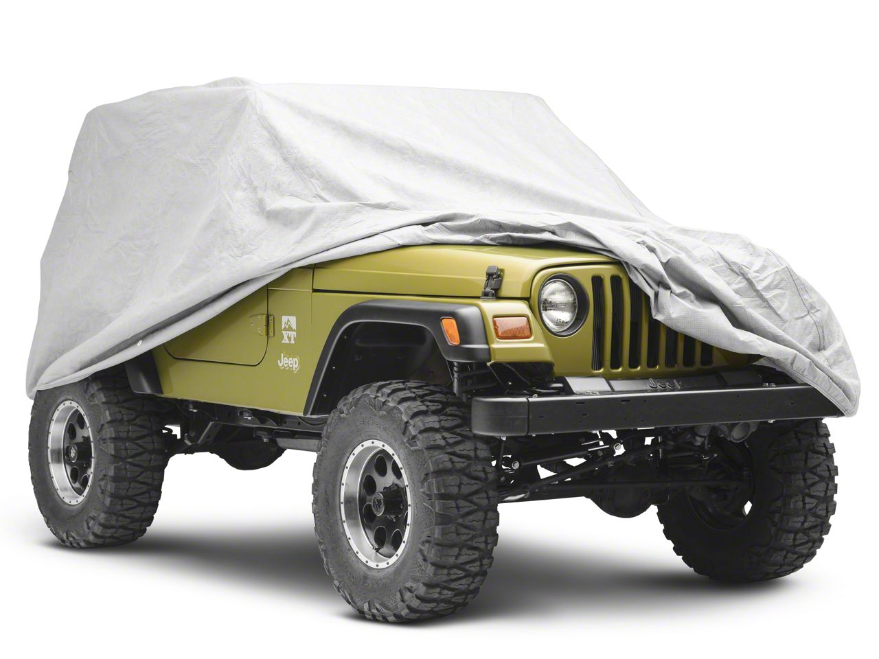 Quality Construction.The Rugged Ridge full car cover is a gray polypropylene cover that protects your CJ5, CJ7, YJ or TJ Wrangler from rain, dust, and dirt. The micropouros film is between two polypropylene water resistant layers that repel water.