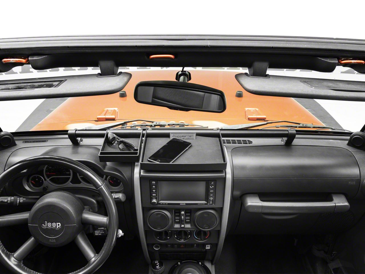 Design. The Rugged Ridge 4 piece interior storage kit includes four different items for use in various areas of the Jeep, including a dash organizer, a rear seat organizer, a cargo area storage tub, and a roll bar sunglasses holder. The dash organizer consists of a pair of plastic trays that fit on top of the dash. The rear seat organizer is a plastic bin with a lid, featuring a second compartment on its side, which mounts onto the center console's rear cup holder. The cargo area storage tub fits in the Wrangler's rear and provides a bin where loose items can be placed to keep them from rolling around, tangling, or tipping over. The roll bar sunglasses holder is a wallet-style zippered cloth case.