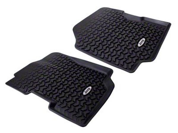 Construction. Rugged Ridge all terrain floor liners are tough injection-molded fixtures made from advanced thermoplastic materials. The surface is nonslip. The material resists sun damage, and is also made to shrug off oil, gas, and even battery acid. A small, decorative Jeep logo is included on each liner of the pair. The liners are exactly fitted to the contours of the Wrangler floor and provide the maximum protective footprint.