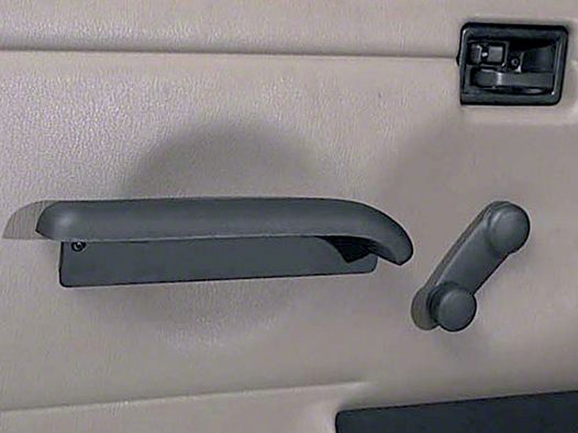 Specs. Depending on your driving style and comfort preferences, you may sometimes wish that your Jeep Wrangler had armrests on the doors. This wish can come true by installing Rugged Ridge's Wrangler Armrest with Full Hard Doors. This gray colored armrest is made out of soft, padded vinyl for comfort and durability. The medium gray tone matches a variety of different Jeep interiors. The armrest is designed to provide a comfortable spot to lean your elbow, either just to ease your arm or for extra bracing when driving on rough or sloping ground.
