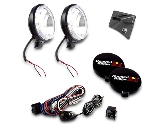 Utility. The Rugged Ridge 5-Piece Windshield Light Mount Kit includes two 100-watt slim lights that mount onto the windshield hinge area to deliver superior off-road lighting. The kit also includes two black windshield mount light brackets and wiring harness with switch. Rock shields keep the slim fog lights protected in varied road conditions.