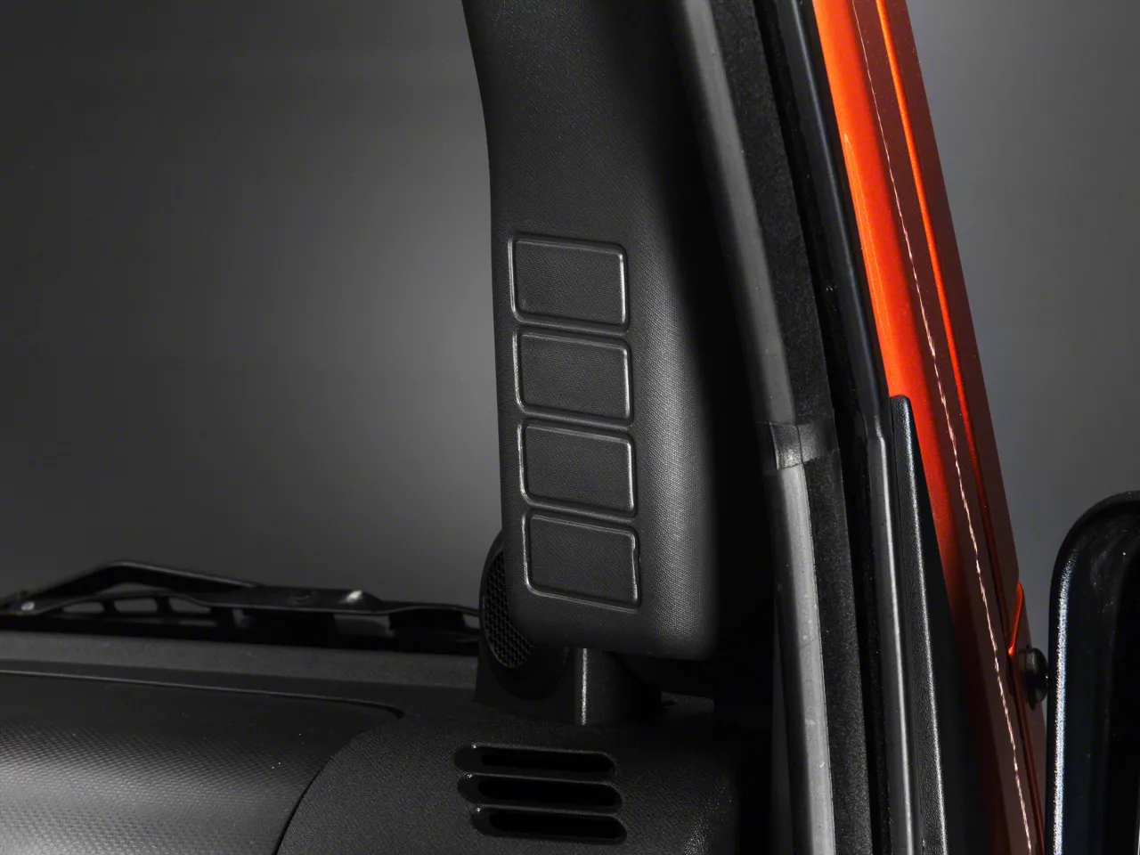 Clean OEM Styling. Are you looking for a handy way to mount additional accessory switches in your 2007-2017 Jeep Wrangler JK? If so, the Rugged Ridge Right Hand Drive A-Pillar Switch Pod is for you. This A-Pillar Pod has pre-molded cutouts that allow you to mount up to four rocker style switches (sold separately) in an easy to reach location. This Kit includes a passenger side switch pod only.
