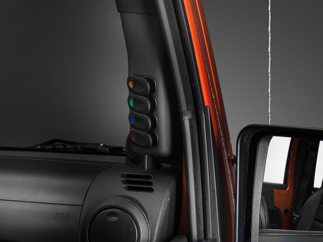 Key Features. Put your Jeep's accessory switches where they won't get in the way: on the A-pillar. This is a beautiful solution to a common problem, becasue putting extra switches on the dash can make things crowded, and even get in the way of the shifter handle. This A-Pillar Switch Pod Kit is a clever solution, with four switches included so you enjoy a consistent look. In fact, the kit was designed to match the overall look and feel of your rig's interior, so it doesn't stick out more than it has to. Amber, green, red and blue lights are featured on the different switches, making it easier to tell them apart quickly. The kit is designed to work on right-hand drive Jeeps only.
