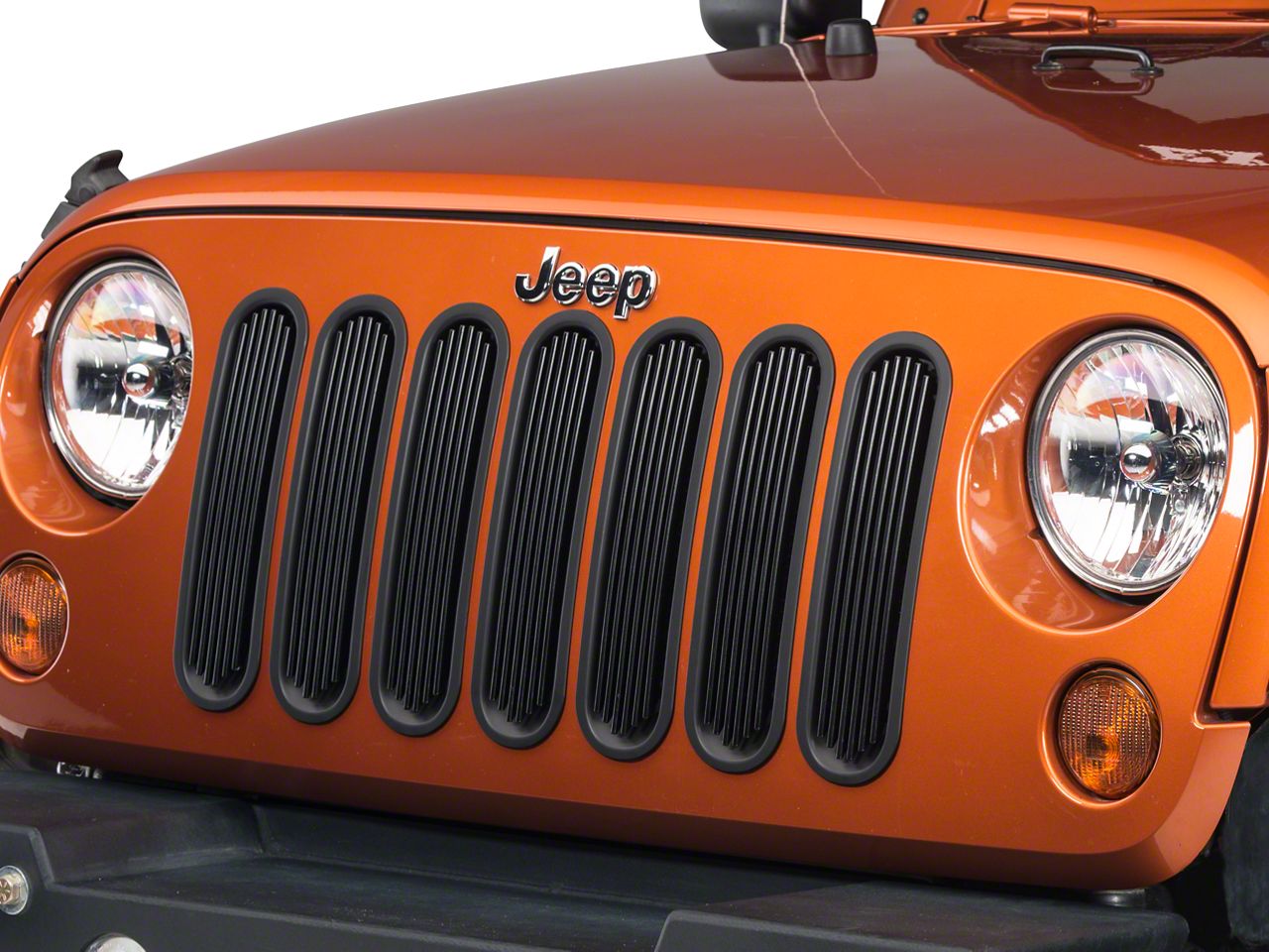 Specs. Make your JK Wrangler look sleek and savage with the Black Billet Aluminum grille Inserts by Rugged Ridge. This 7-piece set of inserts is crafted from billet aluminum, cut from solid pieces of aluminum for maximum sturdiness and burly ruggedness. The black finish gives the pieces a stealthy, aggressive, and dangerous look, imparting a "special forces" aesthetic to your Jeep. The aluminum adds little weight to your vehicle, and is of course proof against rust and most common forms of corrosion, too. These inserts feature tough black plastic surrounds as well.