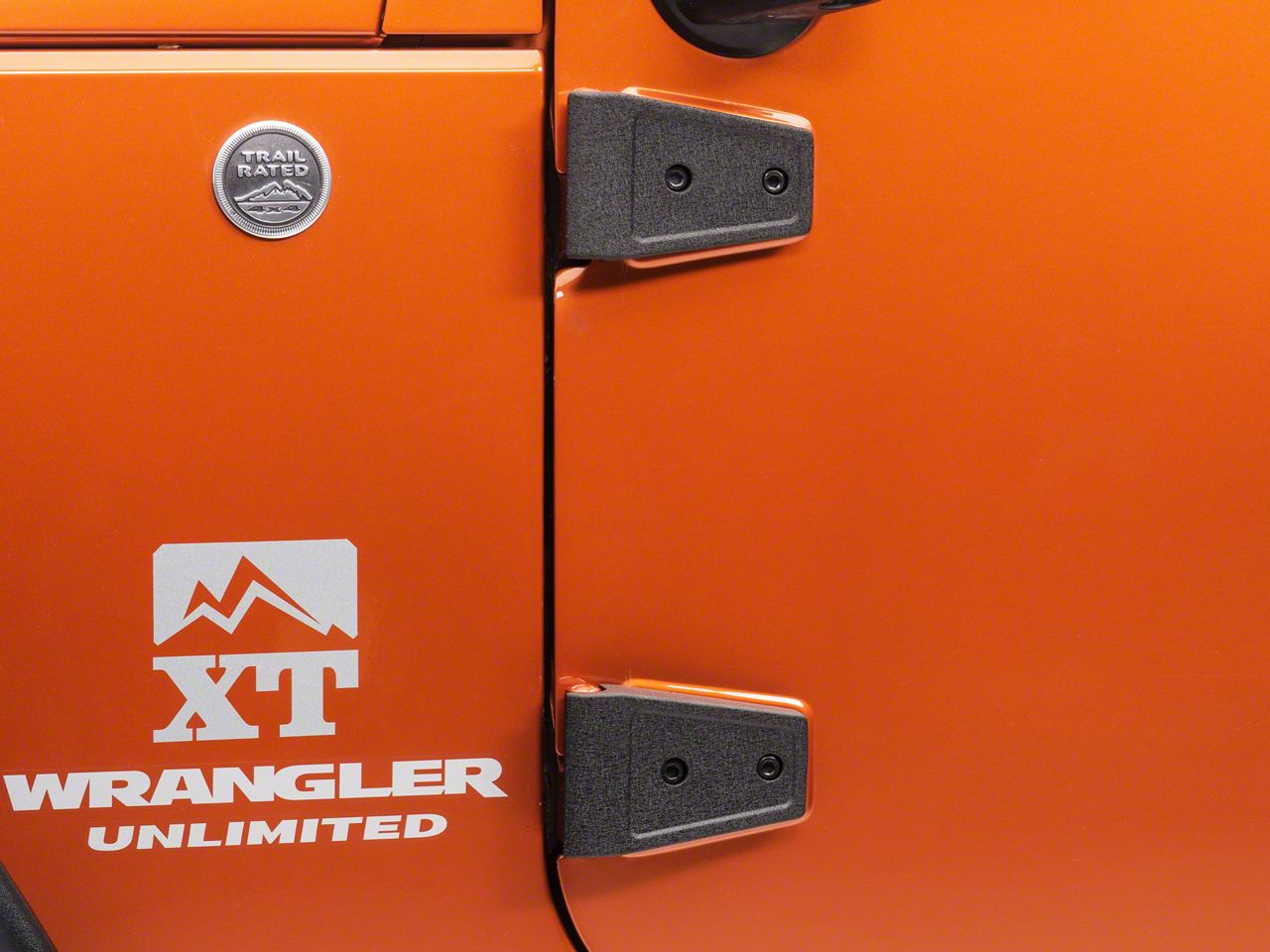 Construction. The Rugged Ridge Black Door Hinge Cover Kit is an 8 piece, black textured steel, bolt on cover for your Wrangler's door hinges! Refresh your Wrangler JK with this kit. The covers are made of cast steel so rust isn't an issue. The covers just bolt over the original hinges with no need for drilling!