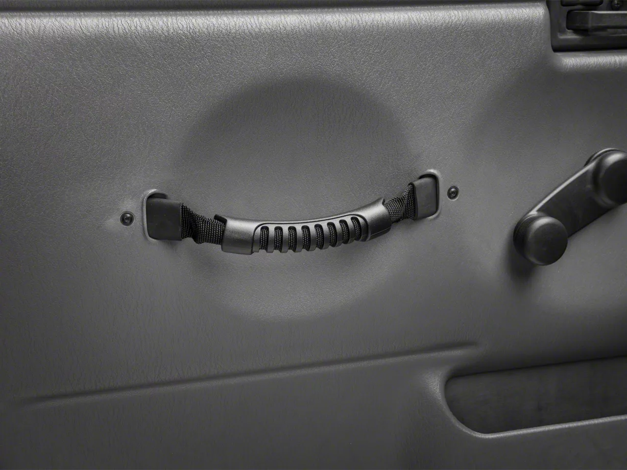 Specs. The Rugged Ridge replacement door handle straps are a direct replacement for the original. They are made from durable nylon webbing and feature an easy grip handle and brass grommets. Rugged Ridge has also included a tool to help make removal of the door panel faster and easier.