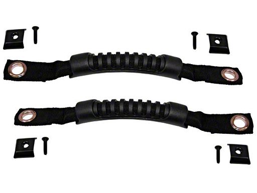 Construction. Do you want your Wrangler to look like the kind of vehicle that an action hero, capable of taking on any peril and winning, would drive? Install these black door handle straps on your 2-door and your ride will look as tough as you want it to. These sturdy, effective, and great-looking strap handles are made out of basically unbreakable nylon webbing, made in hard-hitting black.