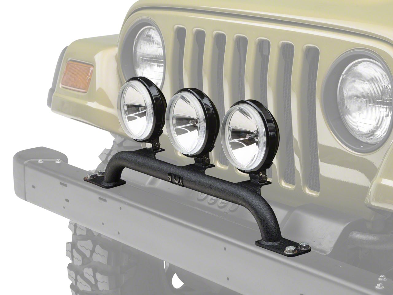 Construction. For late night off-road adventures, this Rugged Ridge offroad fog light kit provides three bright artificial suns for your TJ. This kit is mounted on your front bumper using a tubular steel bar that allows up to three lights to be installed. The bar is finished with a black smooth powder coat finish and can be installed with out the need to remove the front bumper. The lights have a slim design and feature a stamped steel housing with a crystal lens set in shock absorbent waterproof rubber gaskets. The lights have reinforced multi-directional bases for a secure fit so no trail will wobble your lights around.
