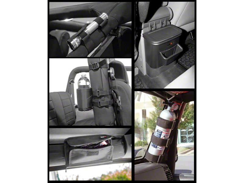 Storage Benefits. This kit enables rational, handy storage of commonly used accessories in the Jeep. The two drink holders attach to the roll bars to place beverages in a more accessible spot than at the front of the center console, or make up for the complete absence of this feature. The fire extinguisher holder keeps the extinguisher undamaged and ready for quick use. The flashlight holder makes certain the flashlight is always to hand when needed, rather than rolled under a seat. The sunglasses bag keeps these items within reach and off the floor or seat where they might be crushed. The rear drink holder rigid container provides a spot for odds and ends to be neatly stored.