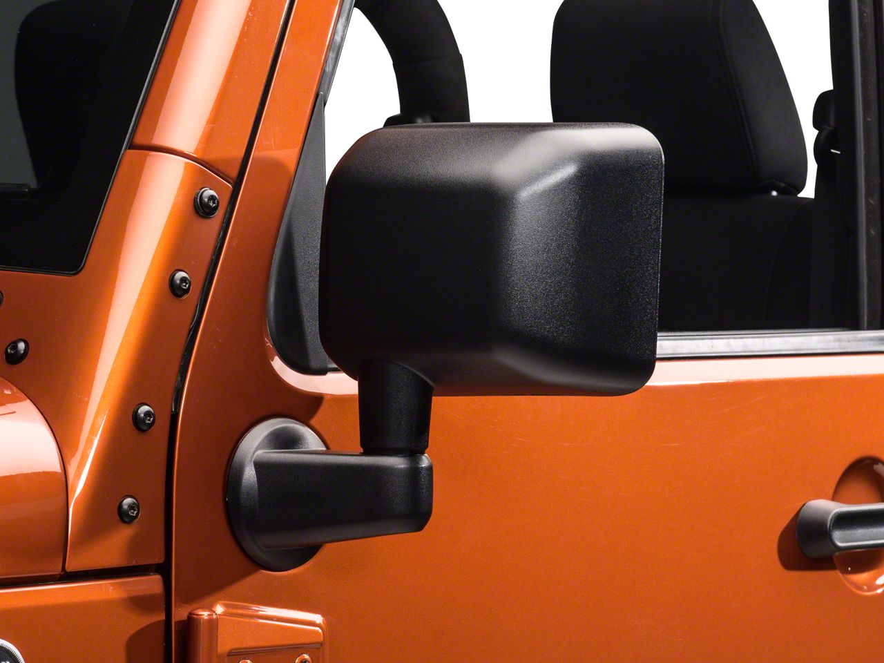 Construction. Give your JK a new look with Rugged Ridge's black mirror kit. Made from tough and durable black UV resistant plastic, years of solar abuse are not an issue. The mirror arm maintains the OEM look and quality, while bolting directly into the original locations, no drilling required.