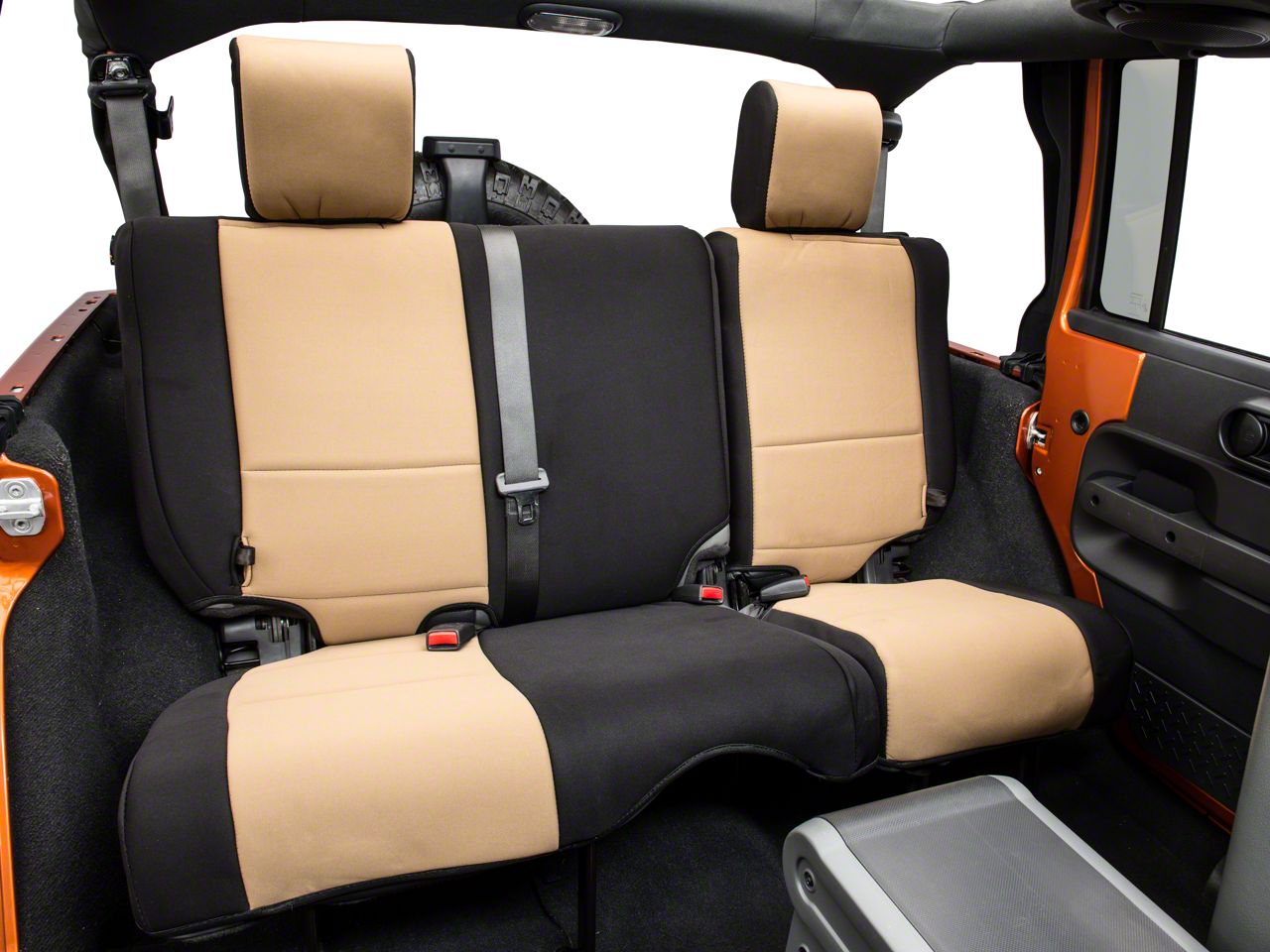 Construction. Add some style and protect your seats from the elements with Rugged Ridge's black and tan rear seat covers for your 4 door JK Wrangler. Seats are made of neoprene, a water, oil, dirt and weather resistant material that is also used for wet suits on a marine grade level. This cover upgrades the look of the interior, adding color and style while providing excellent fitment and comfort.