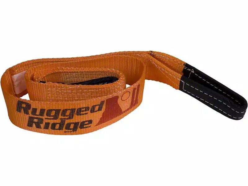Construction. This strap has the quality you've come to expect from Rugged Ridge, featuring abrasion resistant reinforced eyes and will help to prevent you from damaging your winch during a recovery operation. It comes backed by a 5 year limited warranty.