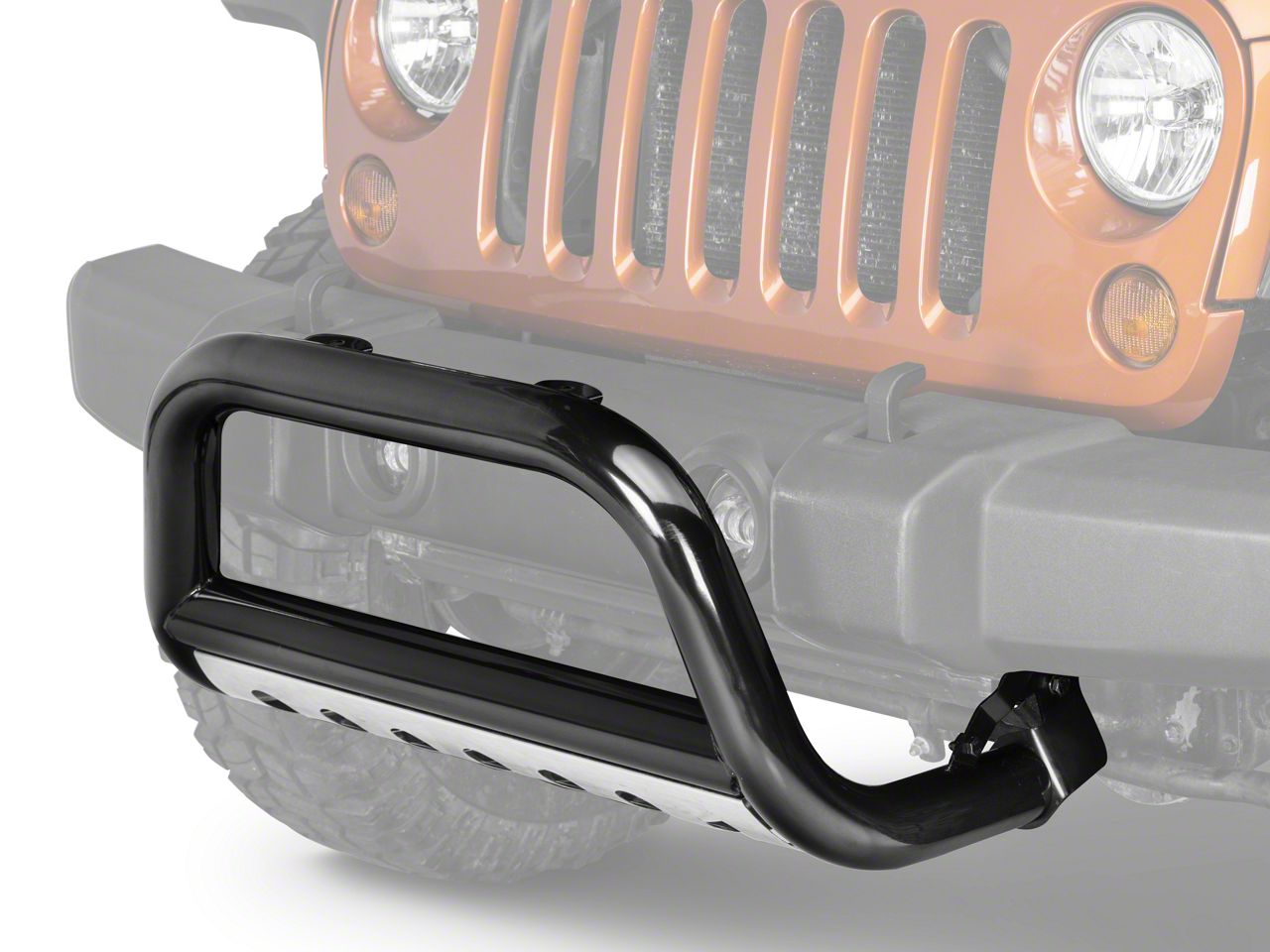 Protection. This bull bar rises from the undercarriage, protecting the front bumper, fog lights and your Wranglers' grille.