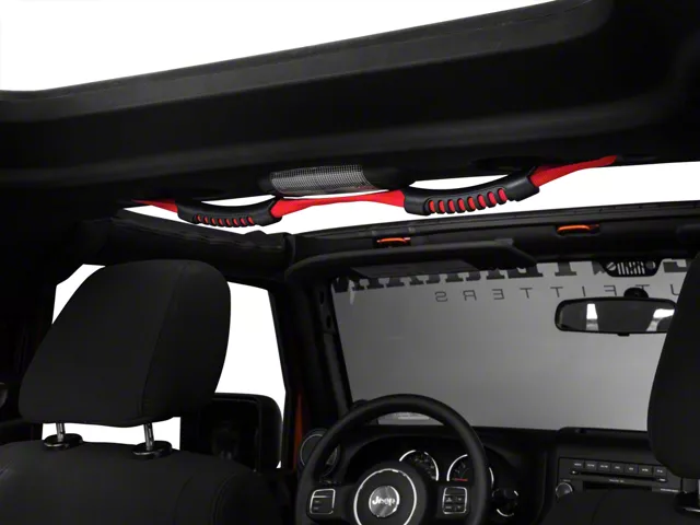 Specs. This center mount dual grab bar handle from Rugged Ridge is made from durable nylon webbing. Soft molded foam handles give rear passengers a comfortable place to hang on when you take your rig off road. The bright red color adds a blast of cool color.