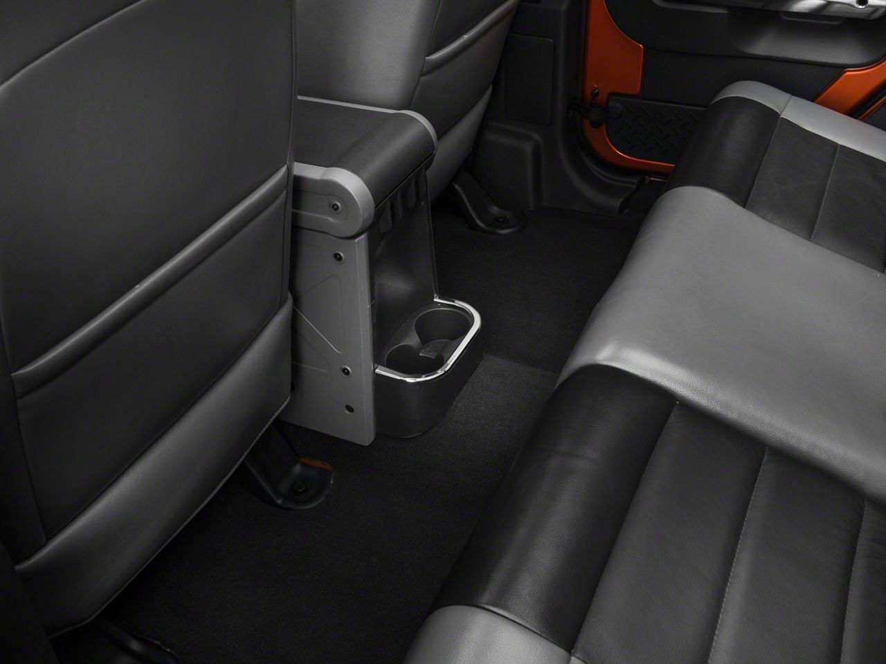 Specs. The Chrome Rear Cup holder by Rugged Ridge lets your passengers enjoy their refreshing beverages in style, and helps give your Jeep interior a pleasing custom look, too. This interior accessory part is made out of long-lasting injection-molded plastic in a black color, with a chromed finish. The material is high quality and made to stand up to years of use. The design also includes built-in automotive adhesive tape for quick, easy, and effective mounting on the rear end of the center console between the front seats.