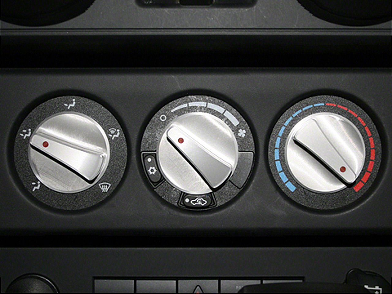 Construction. Responding well under the hand and providing a good grip for the fingers, the Billet Style Aluminum Climate Control Knob Set by Rugged Ridge is made up of direct fit OEM replacement parts. Installation is snap-in by pushing the knob's socket onto the control stem. The red indicator lights up at night, making it easy to see your climate control settings at a glance. This set of 3 knobs comes with a 5 year limited warranty from the manufacturer.