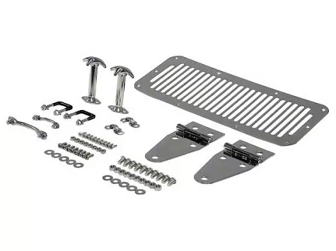 Satiny Stainless Steel Composition. The Rugged Ridge Hood Dressup Kit features fully stainless steel components including a laser-cut accessory hood vent, hood latches, and pins that have all been polished to a mirror-like sheen, providing rust-proof elegance and added sturdiness to your vehicle's hood piece.