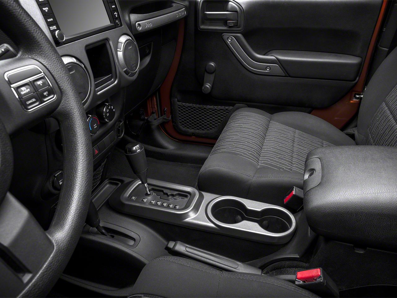 Key Features. Instantly transform the look of your Jeep's interior, giving it a more customized and higher-end feel by installing thsi Center Cup Console. The charcoal finish isn't too flashy, yet is enough to get your rig noticed by the most discerning of critics who pay attention to the smallest of details. Thanks to a design that's based on the contours of the center console, the trim piece fits perfectly. It cleans up easily and looks great year after year, making it a wonderful addition you'll be glad to have.