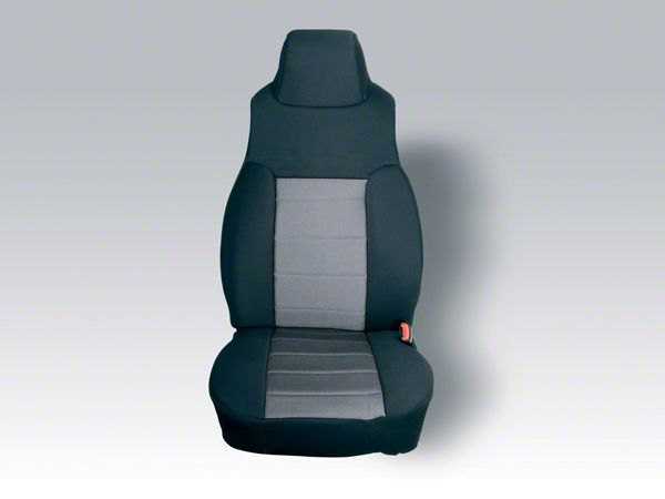 Specs. These custom fabric front seat covers from Rugged Ridge are made from strong, durable poly-cotton that offers many benefits. This isn't your typical stretch nylon that loses shape over time. Instead, it's a durable black and gray material that will last for years to come. Protect your front seats from grime, dirt, and spills and give them a newly upholstered look.