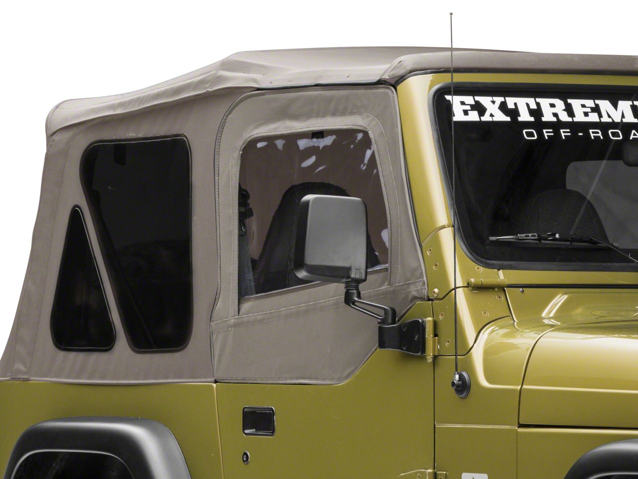 Construction. These Rugged Ridge khaki door skins are manufactured with rugged, durable material that's UV treated to ensure it won't fade no matter how strong the sun's rays. A heavy duty bulb seal further protects you from the elements, and the 30 mil windows are equally durable and strong. Installation is easy, thanks to hook and loop fasteners. Double zippers complete the secure, durable design. No matter how you look at it, these skins are both a great visual upgrade from factory equipment, and a great way to add security and durability.