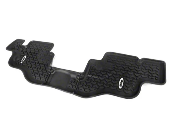 Construction. This rear floor liner from Rugged Ridge is injected molded under high pressure from long-wearing black thermoplastic. This manufacture technique enables the Deep Tread technology approach, which features 3/8 inch high treads and extra-tall perimeter walls. The reverse surface is covered with molded nibs to grip the substrate. Two jeep logos are featured on each floor liner.